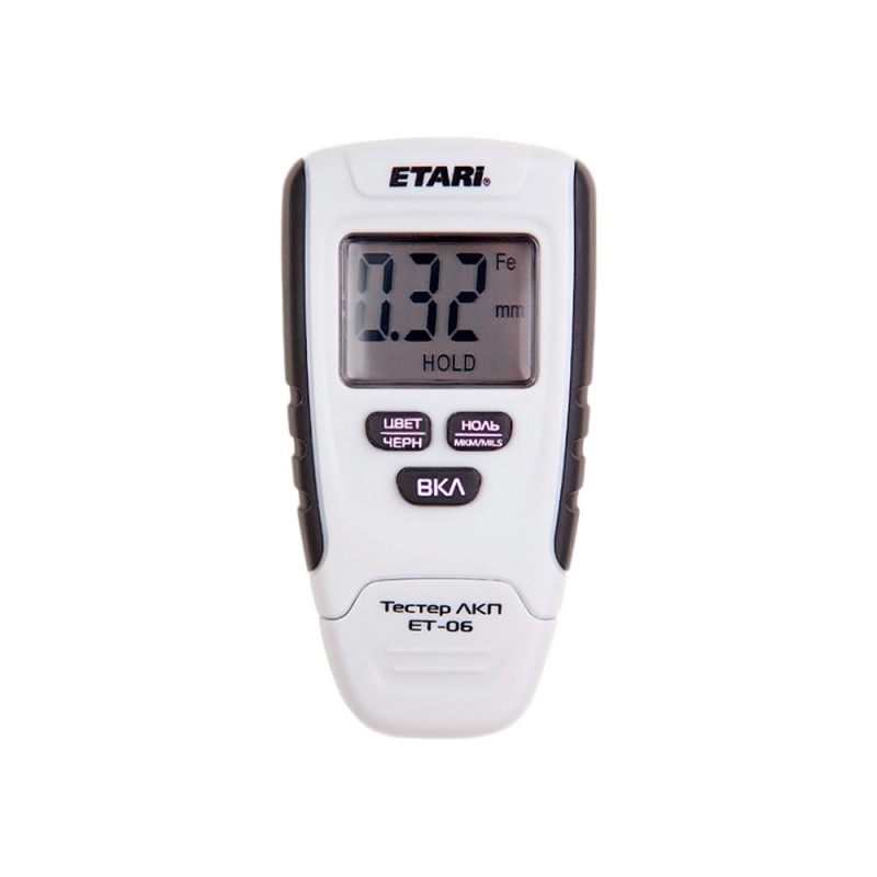 Стоит отметить, что ЕТ-06 - непрофессиональное устройство и в погрешности он уступает более дорогим моделям толщиномеров. Но если ваша цель проверить автомобиль на "битость", ЕТ-06 отлично подойдёт. Он чрезвычайно прост в использовании - на корпусе всего 3 кнопки: 1) кнопка выбора типа металла (цветной/чёрный), 2) "ноль" - калибровка прибора до нулевого значения, 3) кнопка включения тестера. В сравнении с моделью ЕТ-05, данный прибор получил больший температурный диапазон эксплуатации - проверки можно проводить при температуре от -5 до +40°C. Одной стандартной батарейки хватает на 9 часов непрерывных замеров.