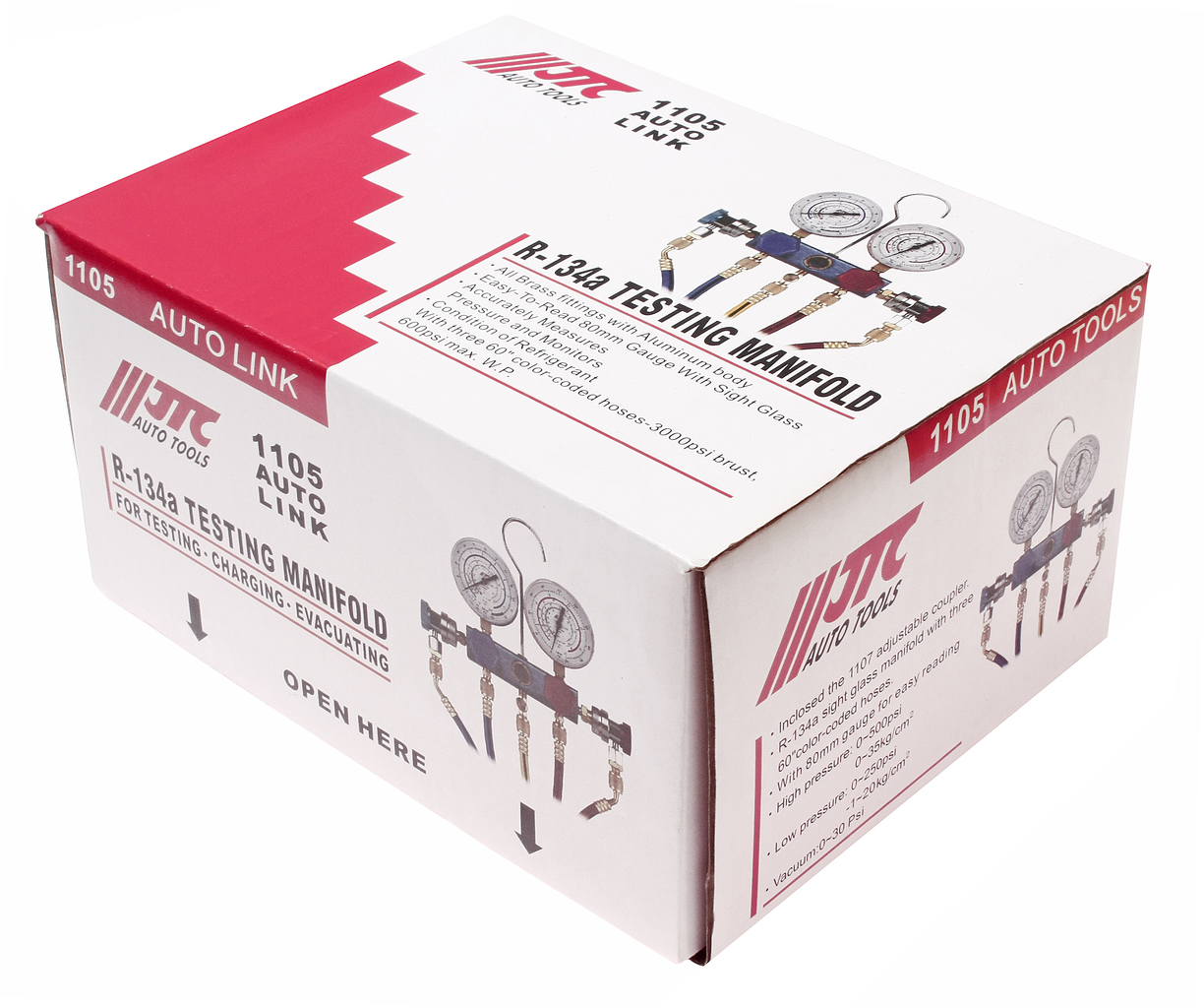 Основу оборудования составляет манометрический коллектор: блок из двух манометров (для измерения давления в каждом из контуров кондиционера) и штуцеров с вентилями.