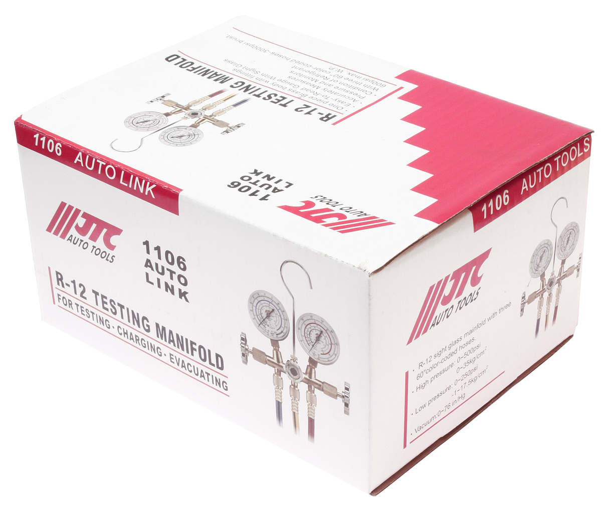 Манометрический коллектор для хладагента R-12, оснащенный 3-мя цветными шлангами длиной 150 см.