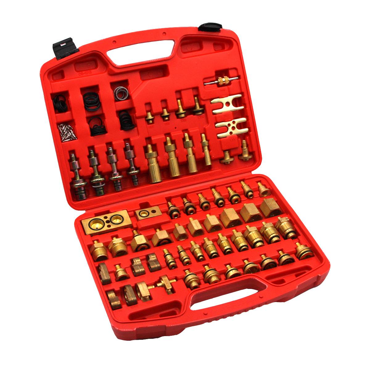 Комплект адаптеров для тестирования системы кондиционирования европейских и американских автомобилей предназначен для проверки расширительного клапана, осушителя, компрессора, конденсатора и испарителя.