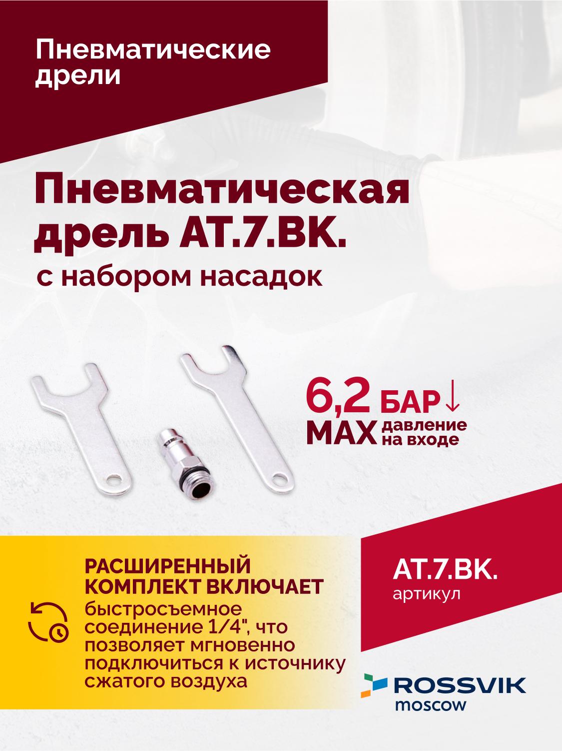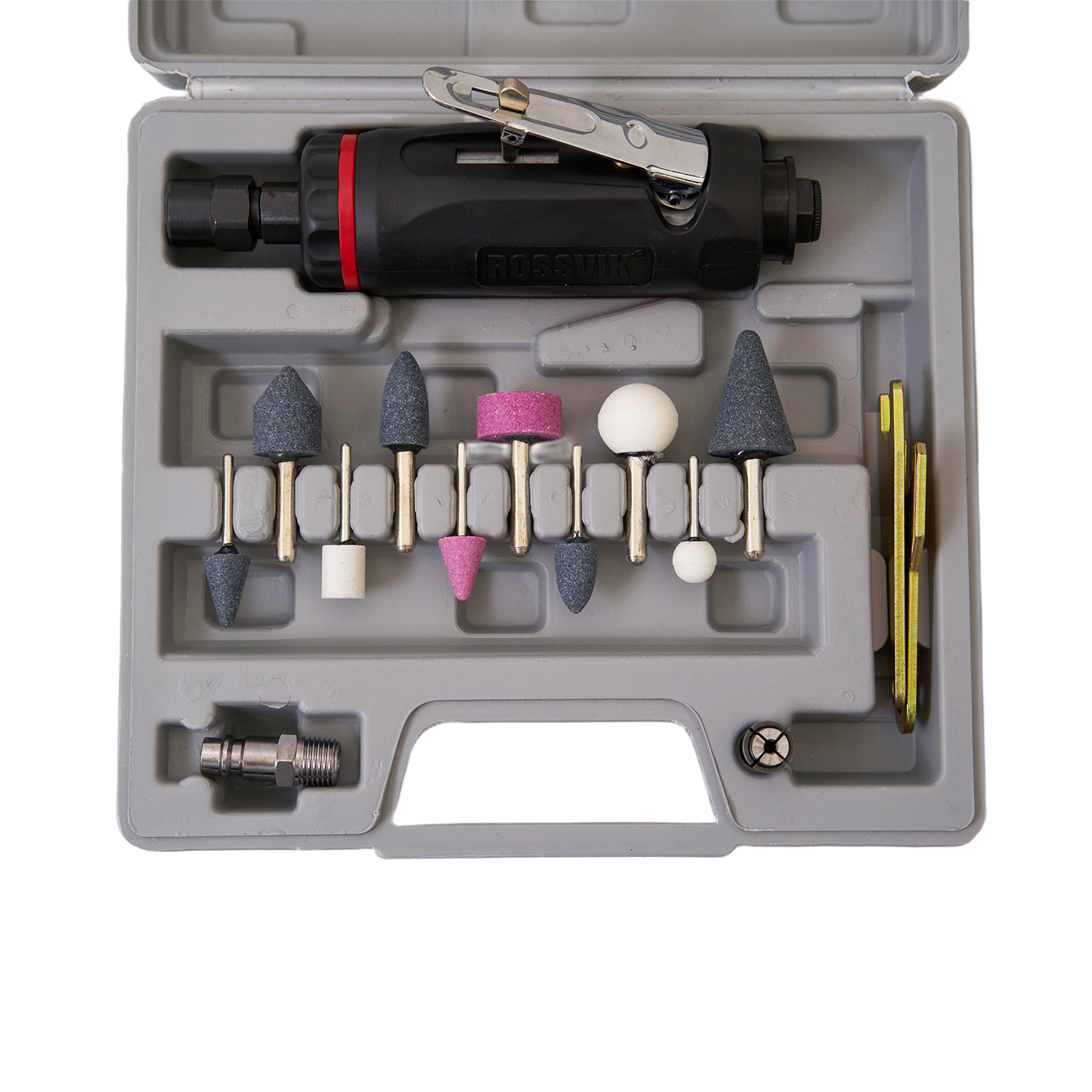 Пневмодрель АТ 7033 ВК-1 с набором насадок Rossvik  AT.7.BK.<br />Набор пневматическая дрель высокооборотистая с абразивными насадками имеет  широкий спектр применения, в том числе применяется  в автосервисах и шиномонтажах для шлифовки и зачистки поверхностей и каналов  колеса и камеры во время ремонтных работ.<br />В наборе 10 абразивных насадок, шлифовальных камней,  диаметром 3 и 6 мм. шаровидной, куносообразной и цилиндрической формы.<br />Пневмодрель проста в эксплуатации, имеет компактные габариты, при работах издаёт минимальный шумовой и вибрационный эффект.<br />В набор также включены цанговый патрон, ключ для технического обслуживания и переходник.