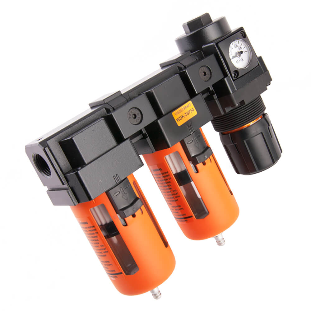 Регулятор давления обеспечивает контроль и регулировку давления в пневмосистеме. Уровень давления регулируется с помощью вентиля и отображается на встроенном манометре.