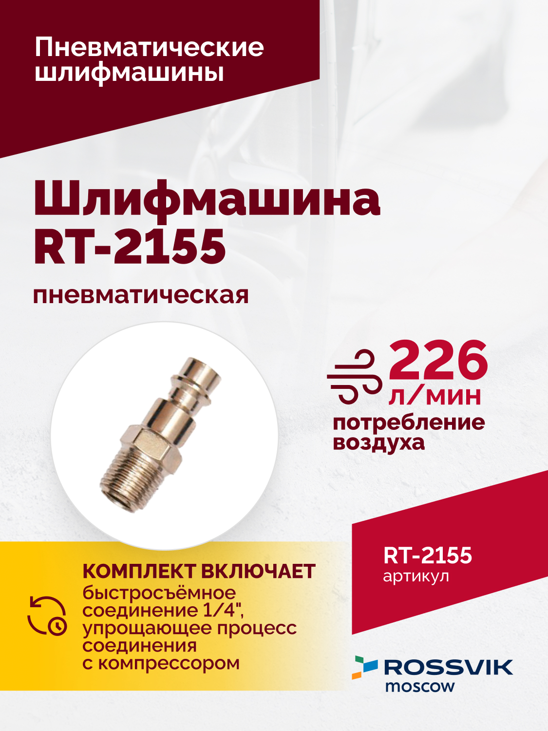Шлифмашина пневматическая RT-2155, 30 мм от бренда Rossvik предназначена для обработки поверхностей с использованием сжатого воздуха. Модель выполнена в компактном корпусе и подходит для выполнения работ по шлифованию дерева, металла и других материалов. Эксцентриковый механизм обеспечивает равномерное распределение абразива и снижает риск задирания поверхности.