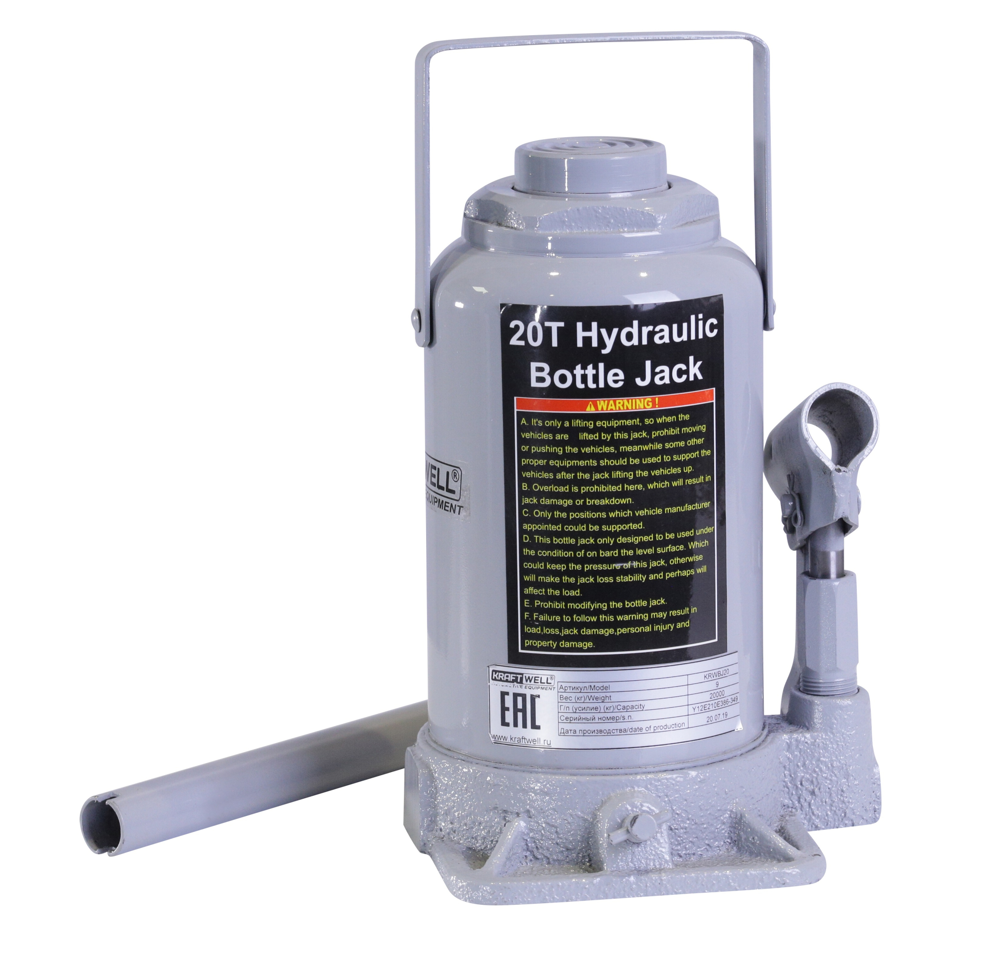 Домкрат бутылочный KraftWell KRWBJ20 предназначен для подъёма тяжёлых грузов и рассчитан на максимальную грузоподъёмность 20 000 кг. Изделие выполнено в соответствии с конструкцией бутылочного домкрата, что обеспечивает устойчивость и надёжность при работе с крупногабаритной техникой и оборудованием. Модель разработана брендом Kraftwell и предназначена для использования в условиях, требующих высокой надёжности и точности подъёма.