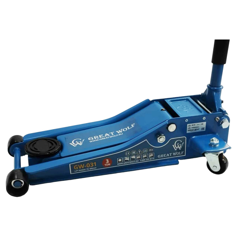 Домкрат подкатной гидравлический низкопрофильный Great Wolf 3 т, 78-505 мм GW-031 применяется преимущественно в автосервисах, шиномонтажных мастерских для подготовки легковых автомобилей, внедорожников и минивэнов к техническому обслуживанию, а также для выполнения работ по ремонту ходовой части авто. Он также идеально подходит для личного использования автомобилистами в своих мастерских и гаражах, особенно при замене колес.