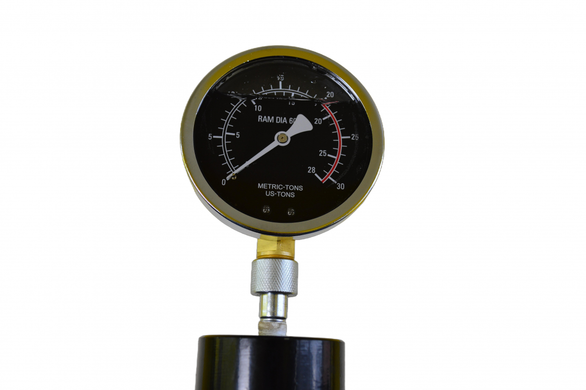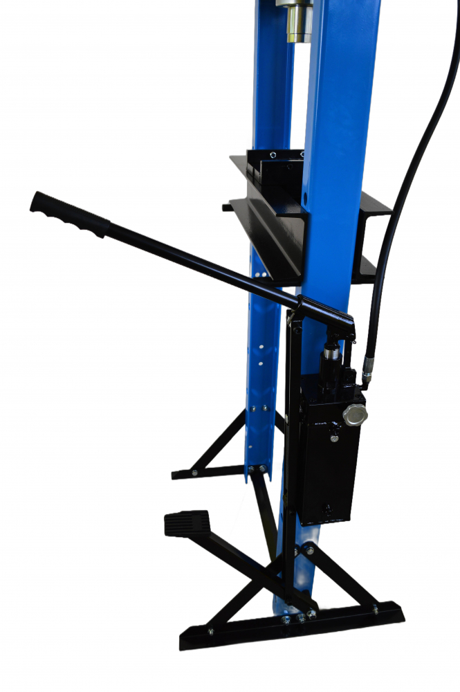 Максимальное усилие составляет 20тонн, ход штока 146мм, регулировка нижнего упора 0-101см. Оборудован как ручным, так и ножным приводом насоса для более удобного использования. Манометр для контроля усилия.