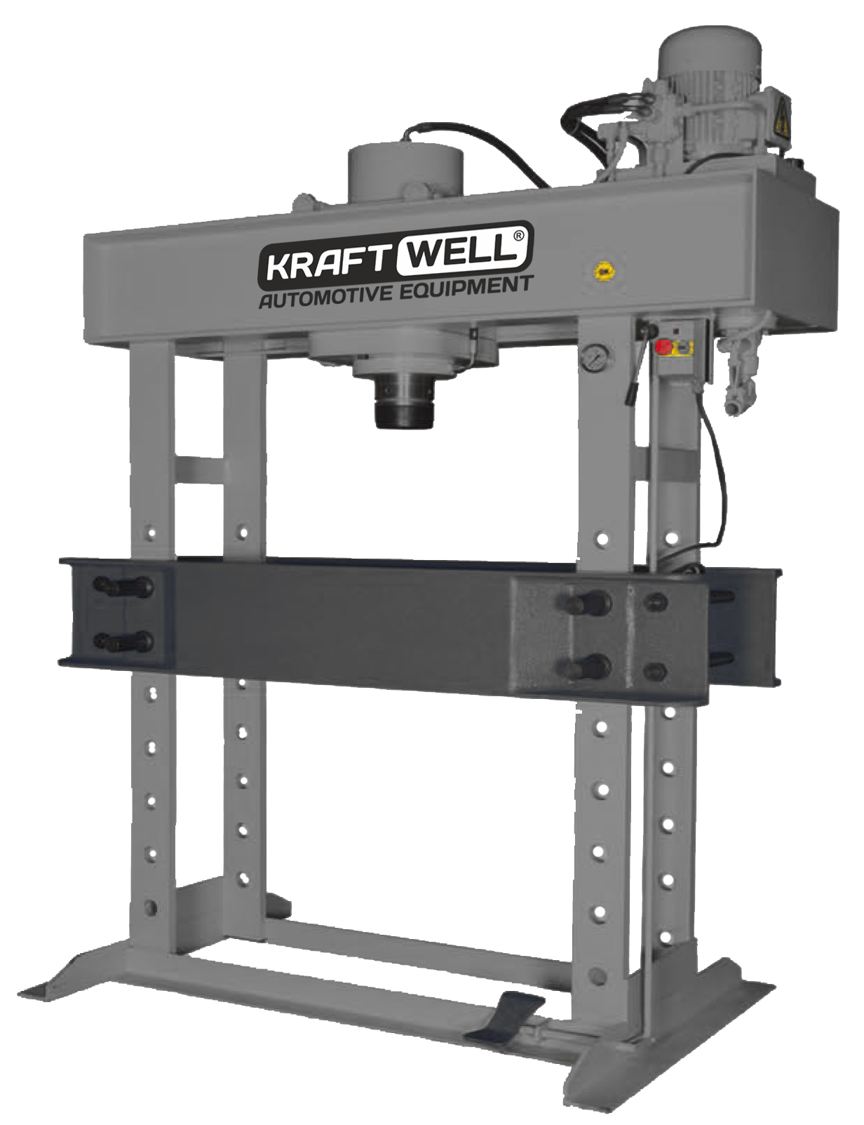 Напольный пресс KraftWell KRWPR100ET предназначен для промышленного применения и оснащён электрогидравлическим приводом. Обеспечивает усилие 100 тонн и рассчитан на работу с деталями, помещающимися в рабочее окно размером 900×900 мм. В конструкции предусмотрены опорные V-образные блоки, обеспечивающие устойчивость и точность выравнивания при сжатии.