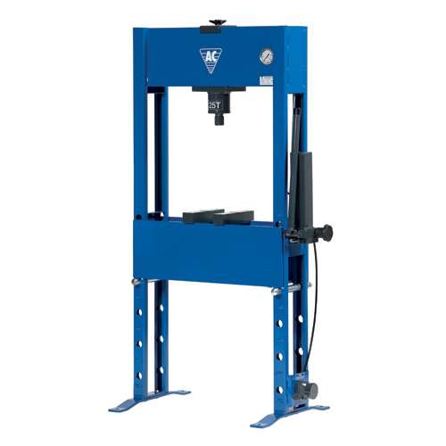 Пресс гаражный гидравлический 25 т PJ25H с пневмоприводом для быстрого подвода штока цилиндра Точный высокоскоростной пневматический подъемник с ножным управлением для приближения обрабатываемой детали Поперечное перемещение цилиндра Встроенный индикатор давления на удобной для глаз высоте Встроенный защитный разгрузочный клапан Сварная рама и плита пресса из долговечной высокопрочной стали Съемная торцевая заглушка подъемника для монтажа различных поршневых головок Поставляется с 2-мя опорами Усилие штока: 25 т Ход поршня: 150 мм Высота: 1620 мм Ширина: 885 мм Ширина между стойками: 640 мм Глубина между стойками: 130 мм Клиренс: 105-780 мм Масса: 135 кг