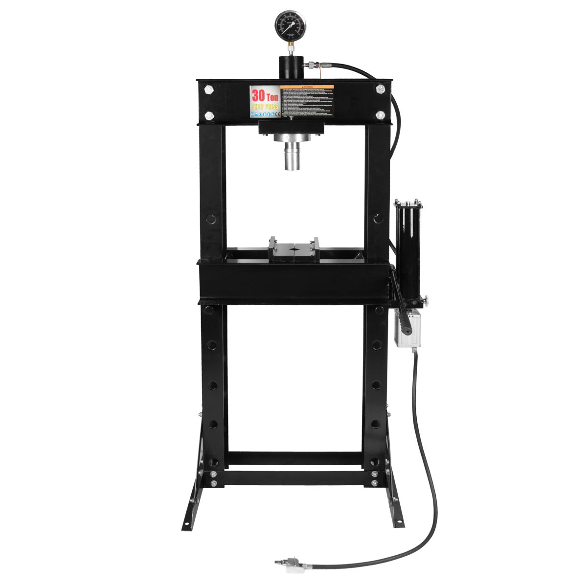 Модель оснащена виброустойчивым манометром с гидрозаполнением. Рабочий стол регулируется по высоте для обработки предметов разных размеров. Прочная пружина обеспечивает быстрое возвращение поршня в исходное положение.