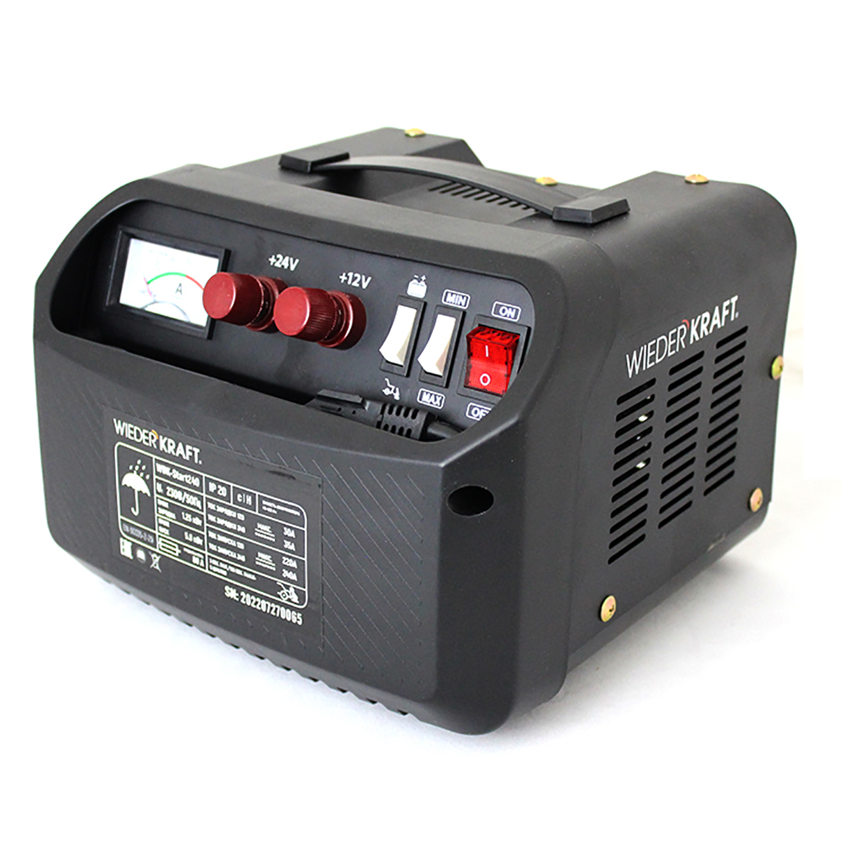 Устройство имеет возможность зарядки и запуска аккумуляторов 12/24 В. Максимальный ток зарядки: 12В - 30 А, 24В - 35 А. Максимальный ток запуска: 12В - 220А, 24В - 240А.