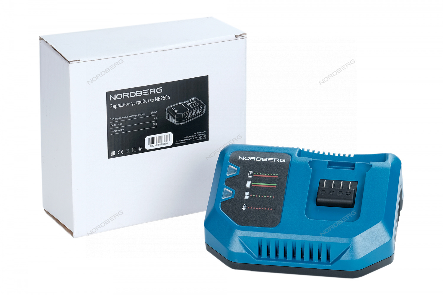 Зарядное устройство Nordberg предназначено для использования с моделями NE9004 и NE9006. Устройство рассчитано на силу тока 4 А и подключается к сети переменного тока с напряжением 220 В и частотой 50 Гц.