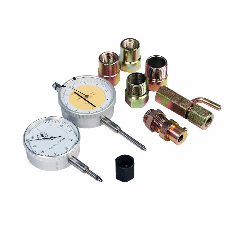 Набор инструментов предназначен для установки подъема плунжера топливного насоса высокого давления распределительного типа VE по методу «капля в секунду». Набор включает в себя часовой индикатор с ходом до 10 мм., держатель для индикатора со сливом и два переходника. Для нормального пуска двигателя необходимо выставить начало подачи ,так называемый термин Pre-stroke (предстрок). Pre-stroke - это момент когда плунжер перекрывает своей рабочей кромкой окно наполнения и начинает нагнетать давление. Данный параметр для каждого автомобиля свой и найти его можно в инструкции к авто или тест плане для ТНВД. Если есть трудности с поиском данного параметра возможно обнаружить его в виде набитых цифр на распределительной головке плунжера. Неправильно выставленный данный параметр ведёт к большим проблемам с запуском двигателя. В торцевой части распределительной головки имеется пробка. Выкрутив данную пробку спецключом, например CT-N723, открывается доступ к плунжеру. Регулировку подъема плунжера осуществляется с помощью регулировочных шайб.