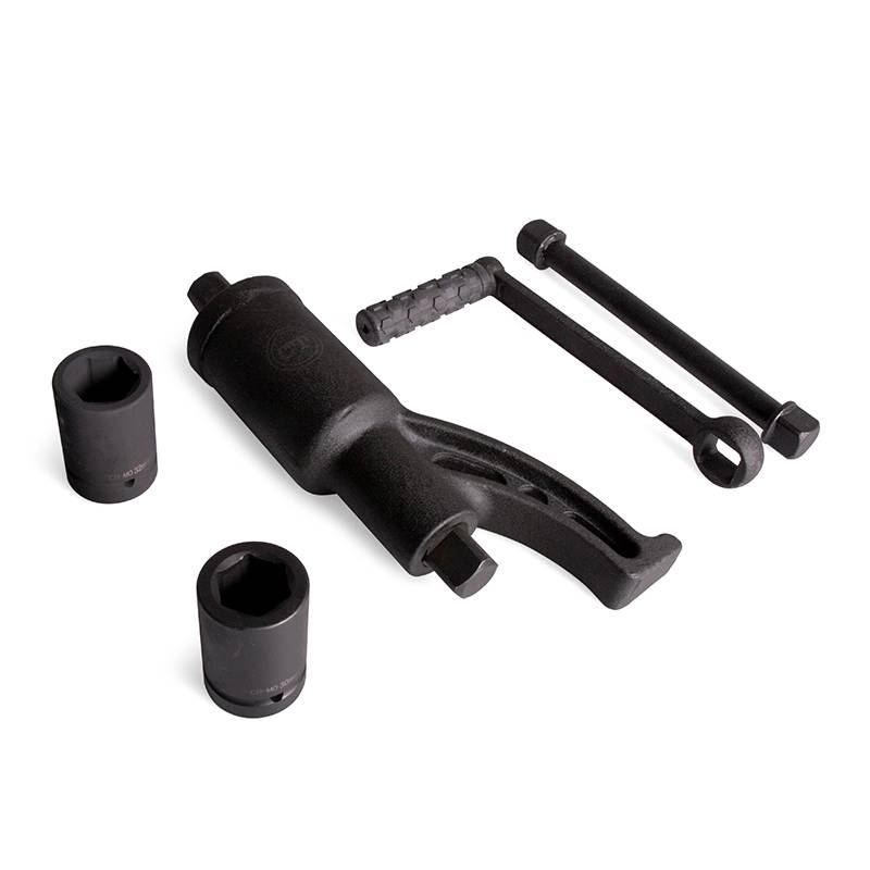 - Особенность мультипликатора крутящего момента: в комплектацию набор входят две торцевые головки длиной 70 мм для гаек 30 и 32 мм.