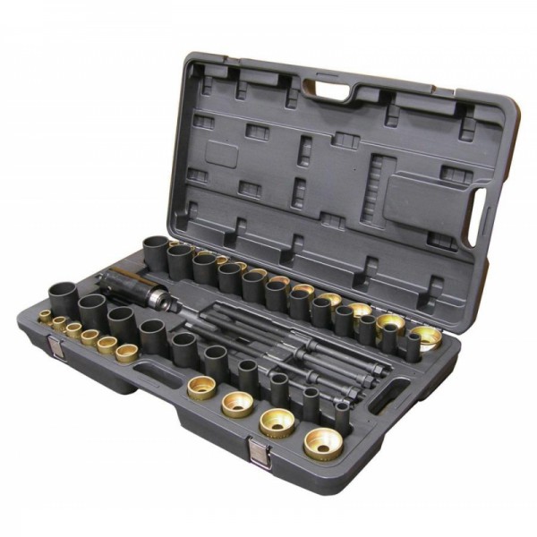 Набор оправок 949T1 предназначен для снятия и установки втулок рулевой сошки и саленблоков. В комплект входят 49 изделий, включая элементы с гидроприводом, что позволяет выполнять работы с повышенной эффективностью и минимальными усилиями. Инструмент разработан специально для задач, связанных с ремонтом и обслуживанием подвески автомобиля.
