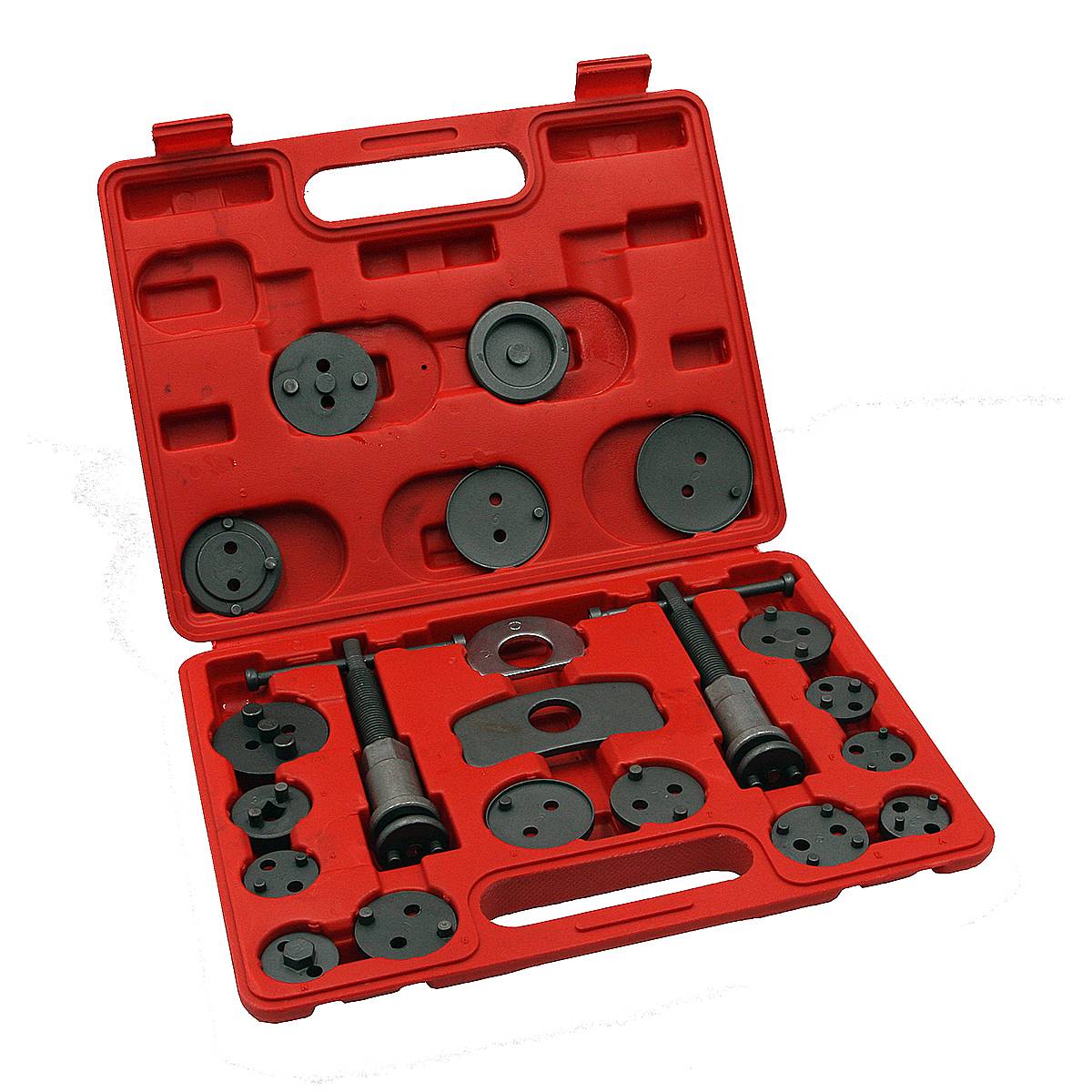 Набор для утапливания поршней тормозных цилиндров 21 предметов предназначен для замены колодок, ремонта суппортов и прокачки тормозной системы. Принцип работы: Подобрать подходящий адаптер. Вставить в супорт и выжать тормозной цилиндр.Такой принцип значительно упрощает установку тормозных колодок. В комплекте: - Винты с правой и левой резьбой - Адаптеры для разных типов супортов Применяемость: - BMW, Ford, VW, Audi, Porsche, Saab, Opel, Volvo, Jaguar, Citroen, Peugeot, Renault, Lancia, Alfa Romeo, Fiat, Nissan, Honda, Subaru, Toyota, Mitsubishi.