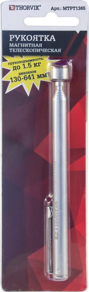 Магнитная телескопическая рукоятка Thorvik длиной от 130 до 641 мм. В торце телескопической части установлен мощный неодимовый магнит, позволяющий удерживать железосодержащие детали массой до 1,5 кг.