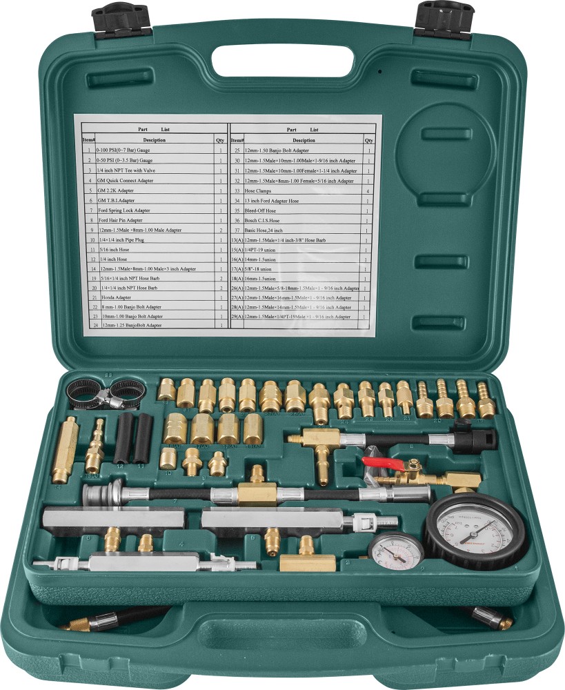 1/4"x1/4" заглушка 1 шт. 5/16”x1/4” штуцер 2 шт. 1/4"x1/4" штуцер 2 шт. (0-3,5Атм.) манометр 1 шт. (0-7Атм.) манометр 1 шт. Хомут 4 шт. 5/16” Шланг 1 шт. 1/4" Шланг 1 шт. Адаптер с золотниковым клапаном FORD 1 шт. 1/4" тройник с клапаном 1 шт. GM T.B.I. адаптер 1 шт. GM адаптер с быстрым соединением 1 шт. GM 2.2K адаптер 1 шт. Игольчатый адаптер FORD 1 шт. 13” шланг с адаптером FORD 1 шт. Шланг перелива 1 шт. Шланг BOSCH C.I.S. 1 шт. 24” основной шланг 1 шт. М8х1 “банджо” адаптер 1 шт. М10Х1 “банджо” адаптер 1 шт. М10х1,25 “банджо” адаптер 1 шт. М10х1,5 “банджо” адаптер 1 шт. Адаптер HONDA 1 шт. Переходник М12х1,5-М10х1 (папа-папа) 1 шт. Переходник М12х1,5-М10х1 (папа-мама) 1 шт. Переходник М12х1,5-М8х1 (папа-мама) 1 шт. Переходник М12х1,5-М8х1 (папа-папа) 2 шт. Переходник М12х1,5-М8х1х75 мм. (папа-папа) 1 шт. Переходник М12х1,5-5/8” (папа-папа) 1 шт. Муфта 5/8”х М18 1 шт. Переходник М12х1,5-М16х1,5 (папа-папа) 1 шт. Муфта М16х1,5 1 шт. Муфта М14х1,5 1 шт. Переходник М12х1,5-М14х1,5 (папа-папа) 1 шт. Муфта 1/4" 1 шт. Переходник М12х1,5-1/4”х19 н/” (папа-папа) 1 шт. М12х1,5х 1/4" штуцер 1 шт. Набор уплотнительных колец 1 шт.
