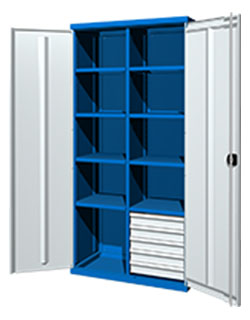 Шкаф для оснастки и инструмента "CLASSIC":Перфорированная задняя стенка, 2 больших полки, 3 больших ящика.габаритные размеры: 950х500х1950 мм.Ригельная система запирания , с тягами.Порошковая покраска RAL 5015;9007;3000; 5015/9007;3000/9007).Возможно
