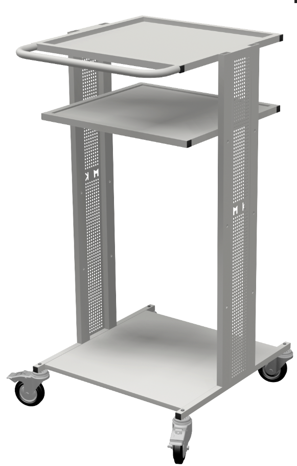 Тележка диагностическая открытая:Возможность горизонтальной и вертикальной установки системного блока.Регулируемая в 3х положениях по высоте полка (шаг 250мм).Возможность установки тумб серии Стандарт.Все колеса поворотные  2 из них с тормозом.Порошк