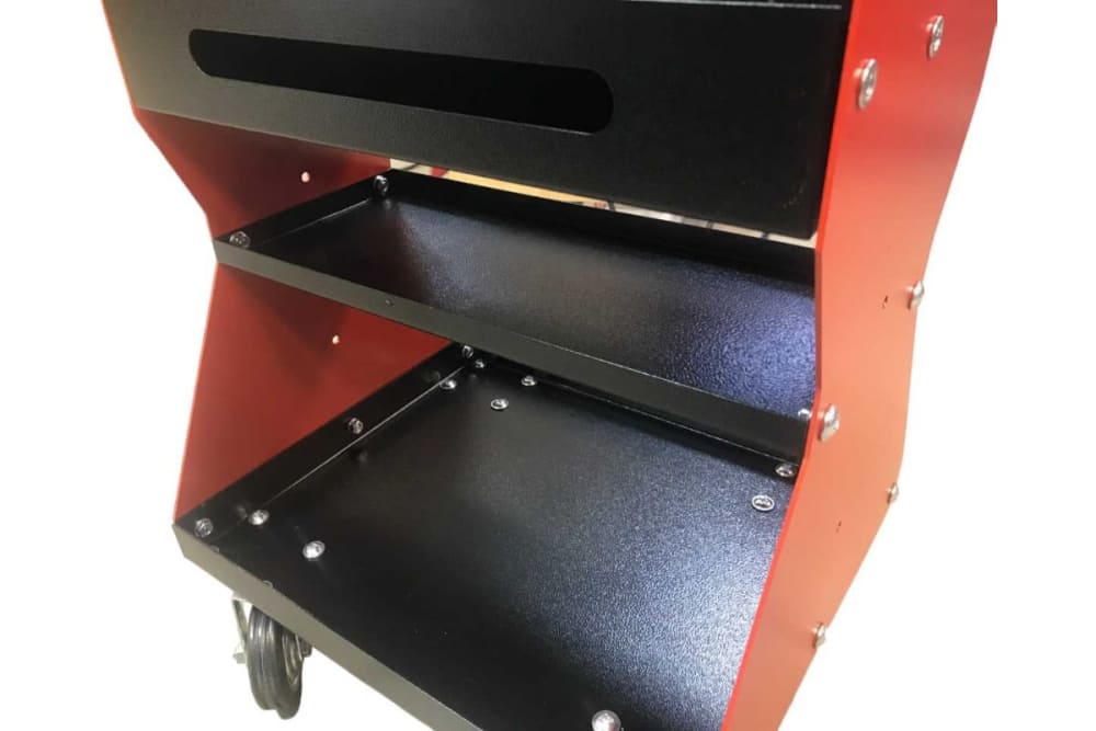 Имеет 2 полки и выдвижной ящик для инструментов, а также есть возможность для установки дополнительных полок или кронштейнов по бокам.