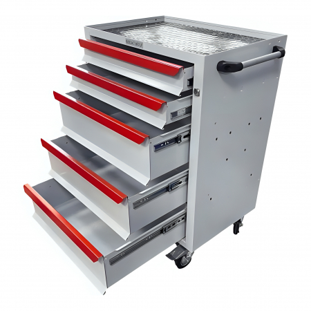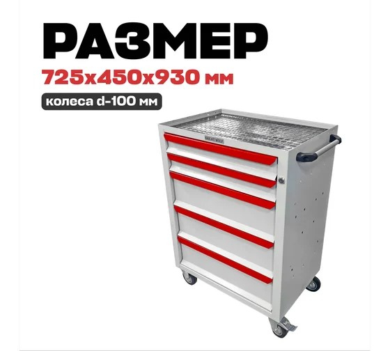 Инструментальная тележка Great Wolf GWT-K5W предназначена для удобного хранения и транспортировки инструмента по ремонтной зоне. Увеличенные колеса с блокирующим механизмом надежно фиксируют тележку на месте. Тележка закрывается на ключ. 3 нижних ящика глубиной 155мм и 2 ящика глубиной 75мм позволяют хранить как ложементы, так и крупногабаритный инструмент.