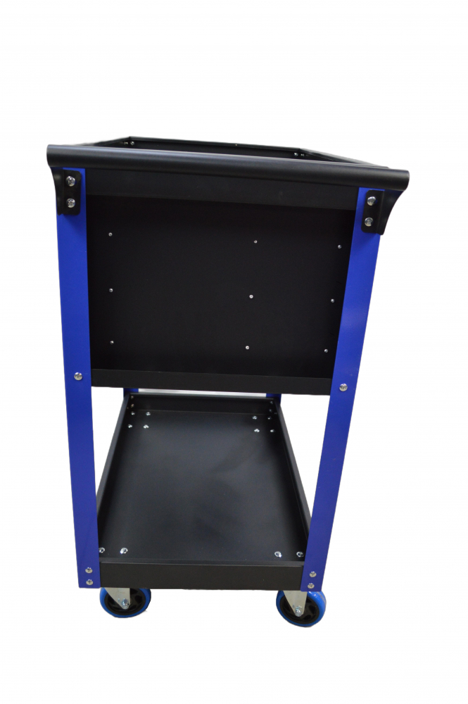Для повышения мобильности и легкости перемещения, тележка оснащена двумя поворотными колесами с надежными креплениями. Благодаря этому, даже при полной загрузке, перемещать тележку по рабочей зоне не составит труда.
