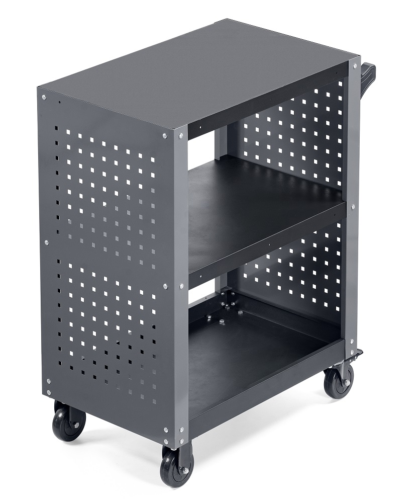 Тележка инструментальная с 3 открытыми полками и перфорированными боковинами. Цвет серый.