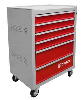 Тележка инструментальная ТТ6GR-R от бренда Thorvik представляет собой 6-ти полочную конструкцию с серой рамой и красными ящиками. Модель разработана для организации хранения и транспортировки инструментов и рабочих материалов. Внешний вид и компоновка отражены в фотографиях товара.