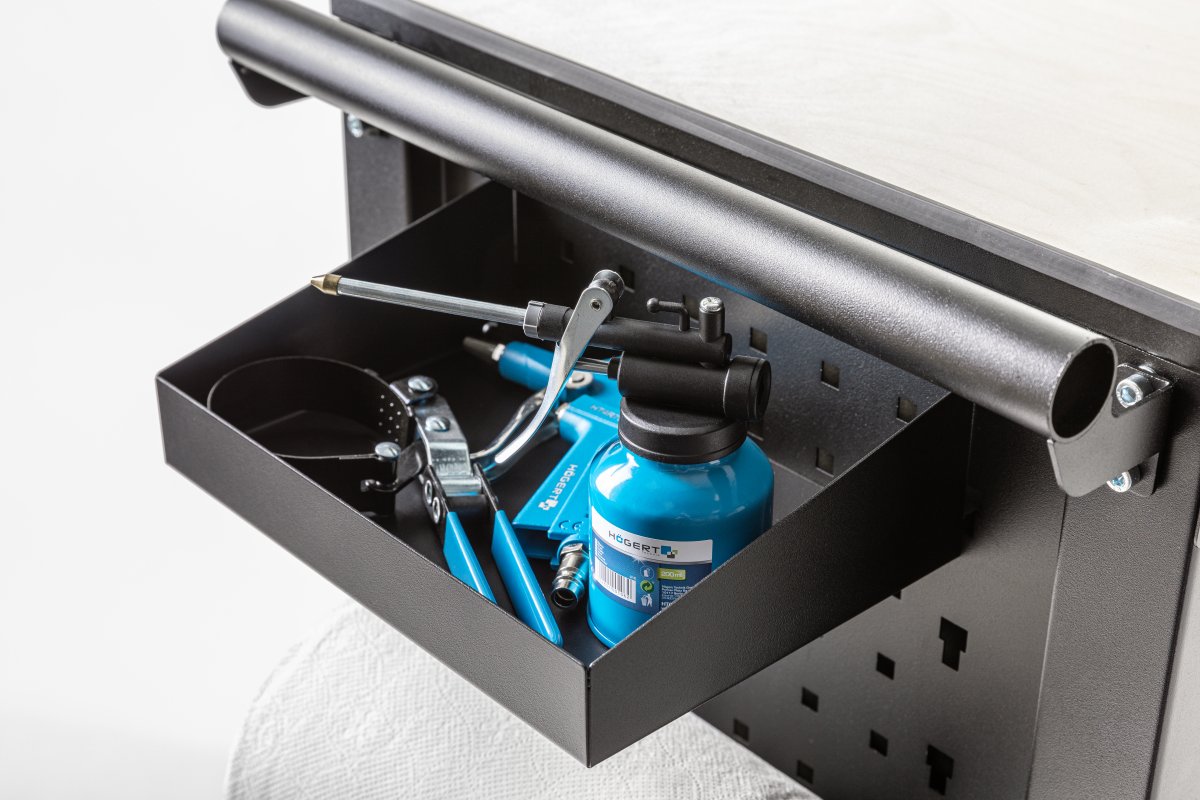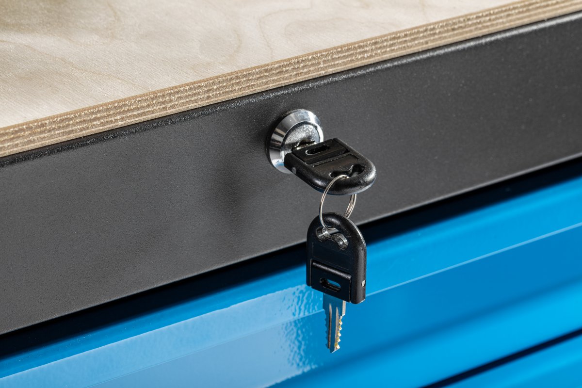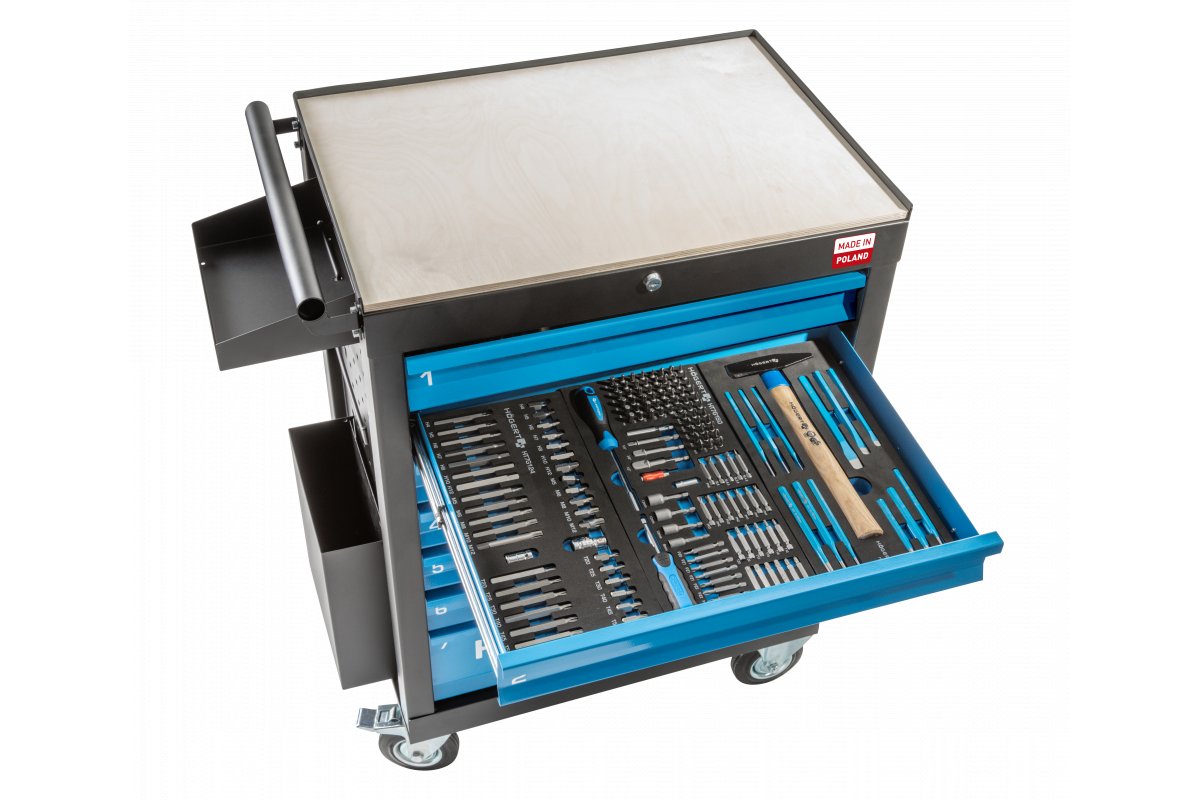 Практичный и вместительный шкаф для мастерской с 7 выдвижными ящиками вместе с дополнительными принадлежностями и вставками для инструментов, итого 304 предмета. Прочная и надежная конструкция гарантирует долговечное использование в условиях мастерской, а 4 колесика, включая 2 поворотных, обеспечивают мобильность, так что шкаф всегда будет находиться в нужном месте. Он идеально подходит для авторемонтных мастерских, а также для гаража каждого умельца.