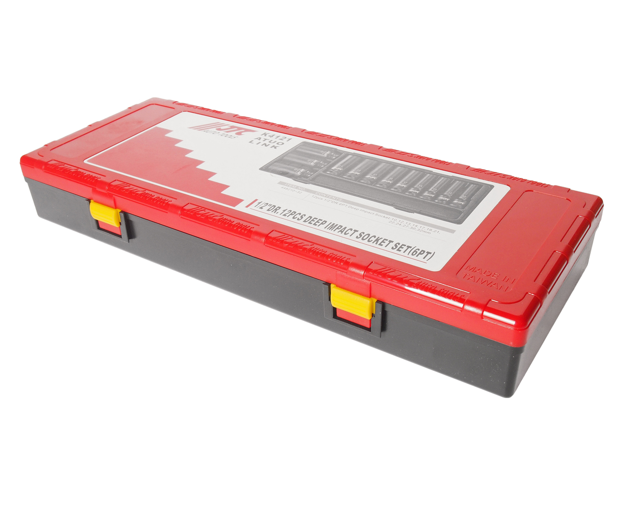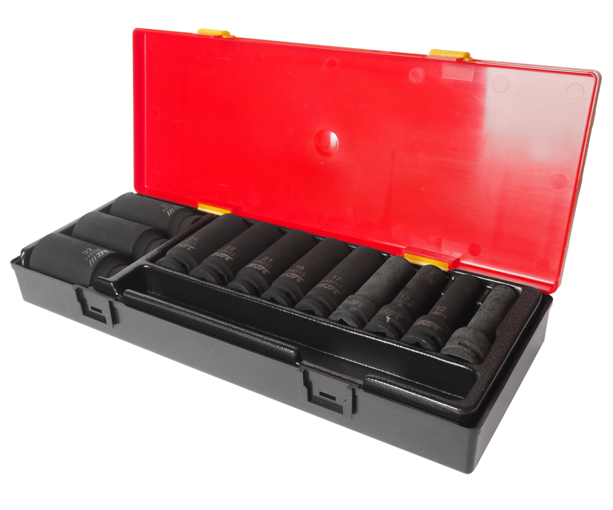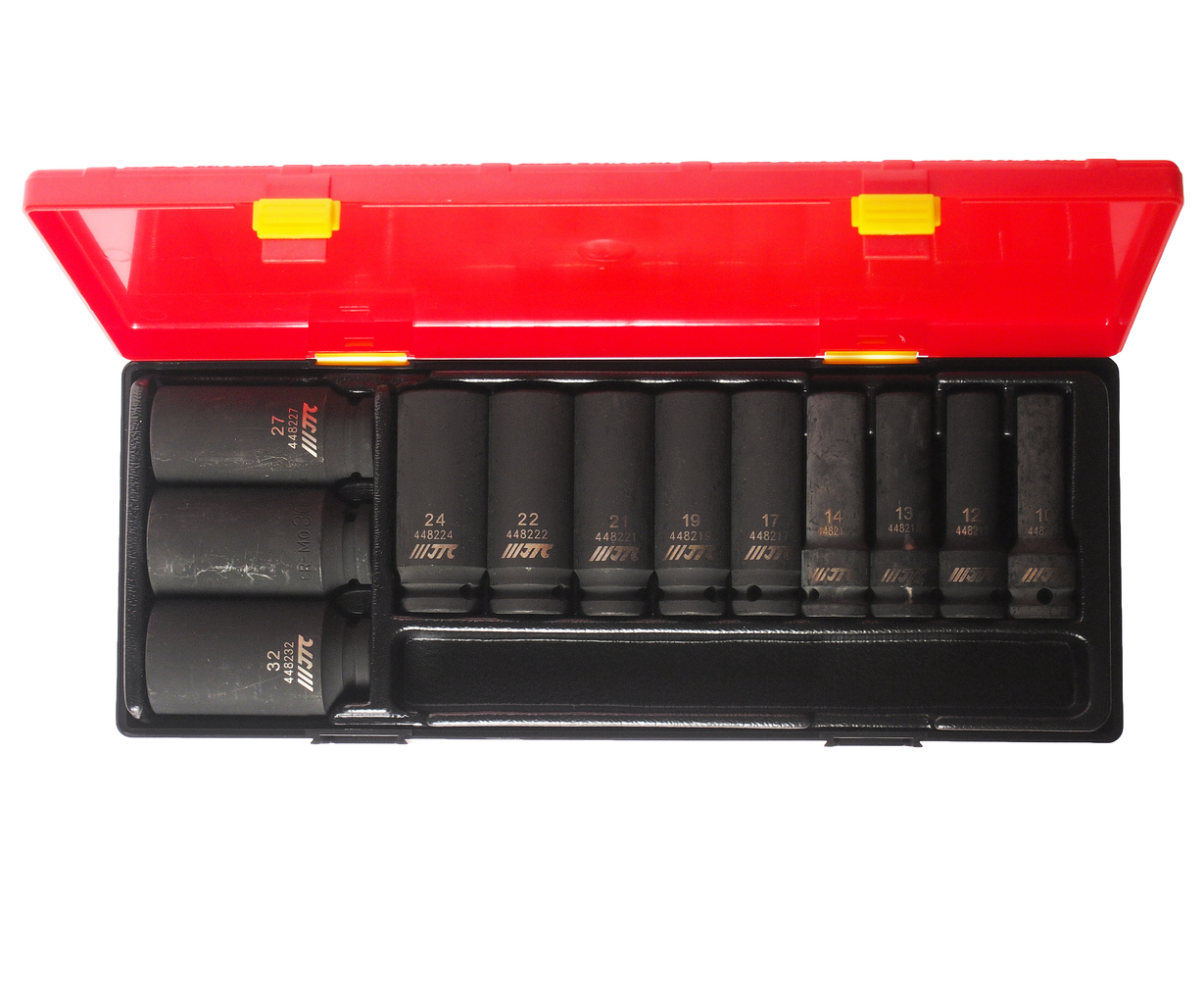 Артикулы JTC-448210-32: ударные шестигранные головоки 1/2": 10 мм., 12 мм., 13 мм., 14 мм., 17 мм., 19 мм., 21 мм., 22 мм., 24 мм., 27 мм., 30 мм., 32 мм.- 12 шт.