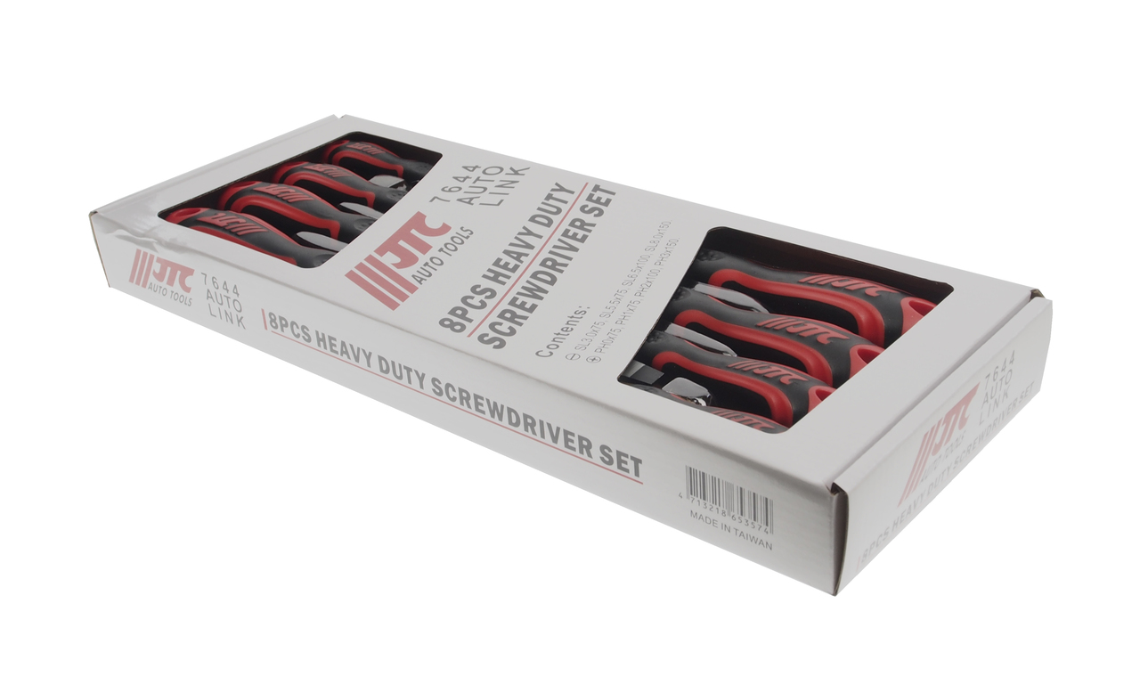 Набор отверток усиленных от бренда JTC включает 8 предметов: 4 плоских (шлиц SL) и 4 крестовых (PH). В комплект входят отвертки следующих типоразмеров: