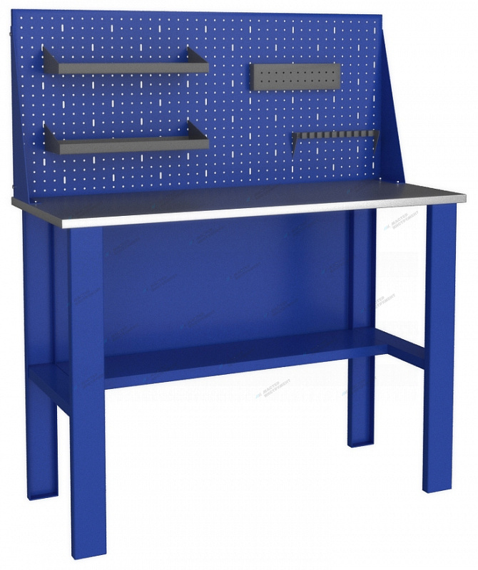 Конструкция отличается устойчивостью, стоит на двух опорах – они изготовлены из прочного листового металла. Для удобства работы имеется экран, на который устанавливаются навески, а также полка внизу. Наличие тумб не предусмотрено.