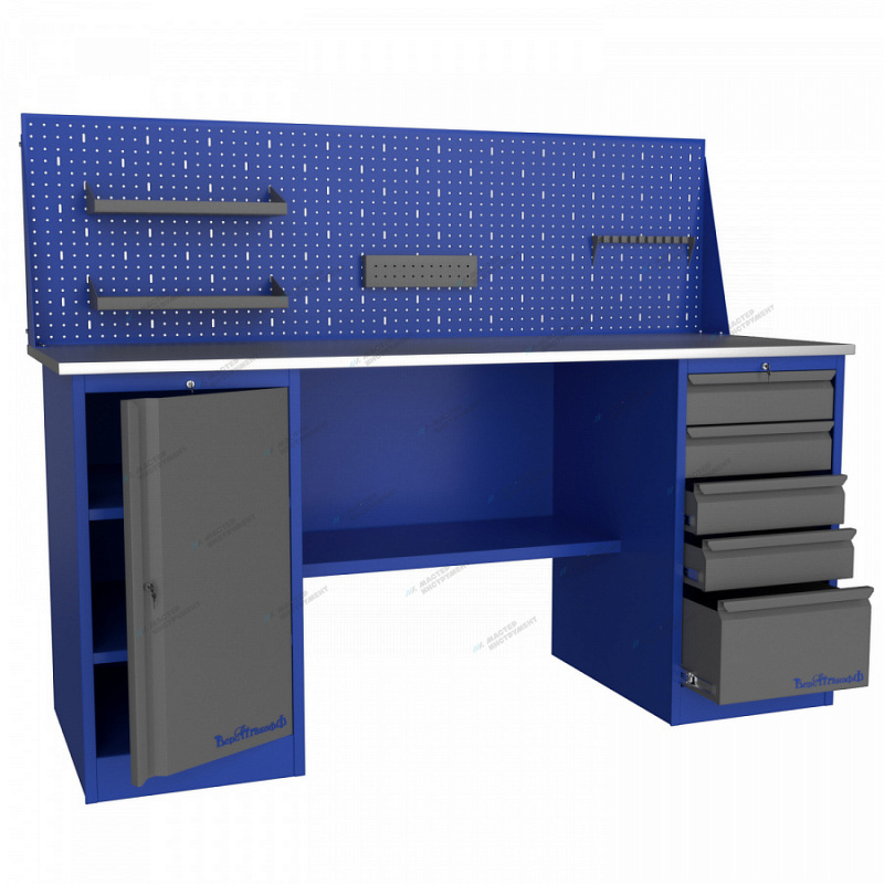 Верстак оборудован двумя тумбами (1 тумба - 5 ящика, 1 тумба с дверью (2 полки)), которые предназначены для хранения инструментов и документации.