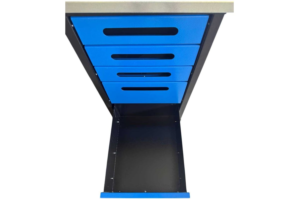 Размер — 1400×700×27 мм. Материал — МДФ с оцинкованным металлическим покрытием. Вы сможете закрепить тиски и выполнять любые силовые работы без опасений за прочность поверхности.