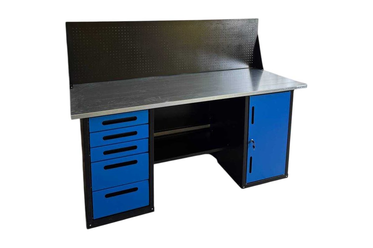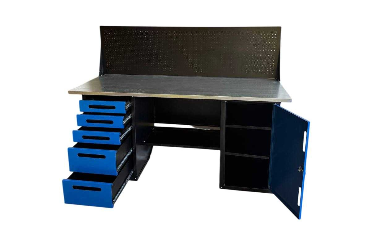 - Прочная столешница — размер 1800×700×27 мм, выполнена из МДФ и оцинкованного металла, выдерживает высокие нагрузки, подходит для установки тисков и выполнения силовых работ.
