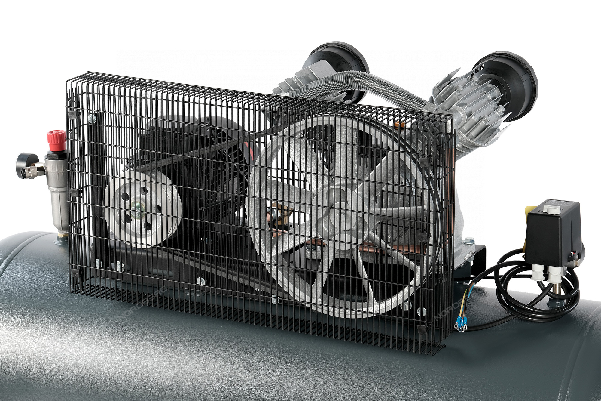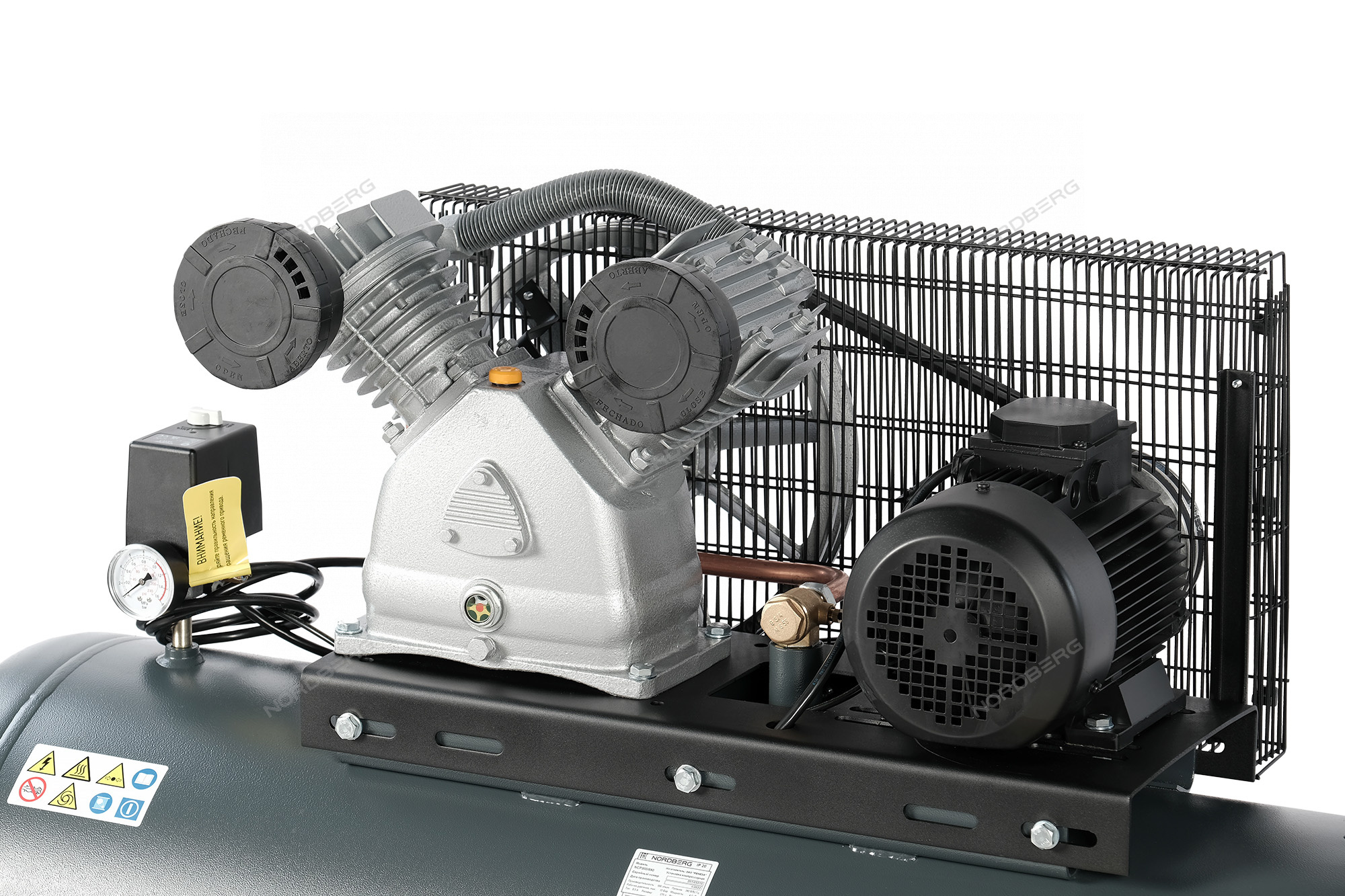 Ременная передача компрессора закрыта решетчатым кожухом, защищающим от повреждений