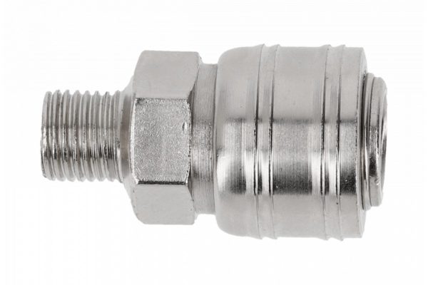 Муфта соединительная M1/4 от бренда HOEGERT предназначена для использования с пневмоинструментом. Изделие обеспечивает надёжное соединение компонентов пневматической системы. В комплект входят фотографии товара, демонстрирующие его внешний вид и детали конструкции.