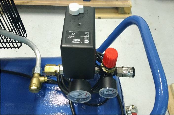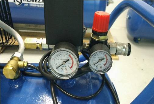 2 манометра для указания общего давления в ресивере и давление, на выходе которое можно регулировать с помощью установленного на нем редуктора.