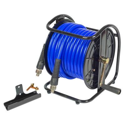 • Шланг размещён на катушке, расположенной на специальной раме. Конструкция позволяет разместить шланг на рабочем месте так, как вам удобно, а по окончании работы свернуть шланг и перенести раму с катушкой на место хранения.