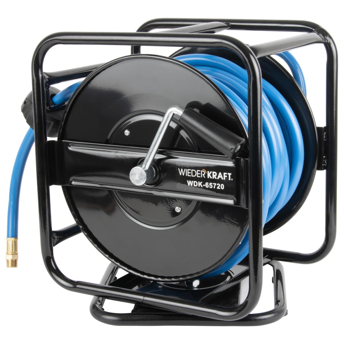 Поворачиваемая на 360° ножка предотвращает опрокидывание во время работ. Шарнирное соединение на шланге подачи воздуха. Защита катушки по всему периметру за счет каркаса из стальных труб. Складная приводная рукоятка. На конце шланга резьбовое соединение.