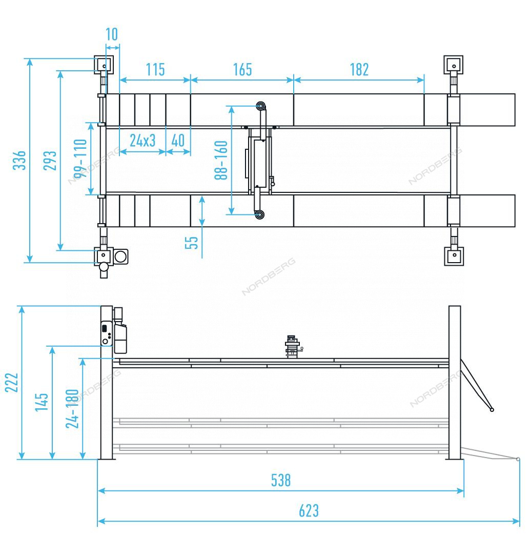 Четырехстоечный подъемник с пневмогидравлической траверсой NORDBERG 4453JAG – безопасное и надежное оборудование для проведения работ по регулировке углов установки колес, диагностике и ремонту автотранспорта в автосервисах и СТО.