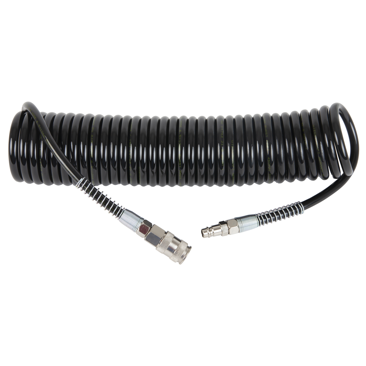 Пневматический спиральный шланг длиной 8 метров, с диаметром 6,5 мм внутренний и 10 мм внешний, оснащен быстроразъемными соединениями (БРС).