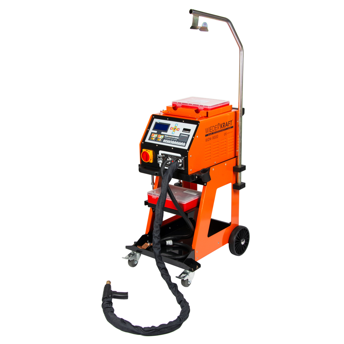 Модель оборудуется транспортировочной тележкой с отсеками для хранения сварочных принадлежностей, а также эргономичной ручкой и колесами для легкой транспортировки устройства. Аппарат подключается к трехфазной сети переменного тока 380 В. Держатель сварочного пистолета, закрепленный на корпусе аппарата точечной сварки, делает работу еще более удобной.