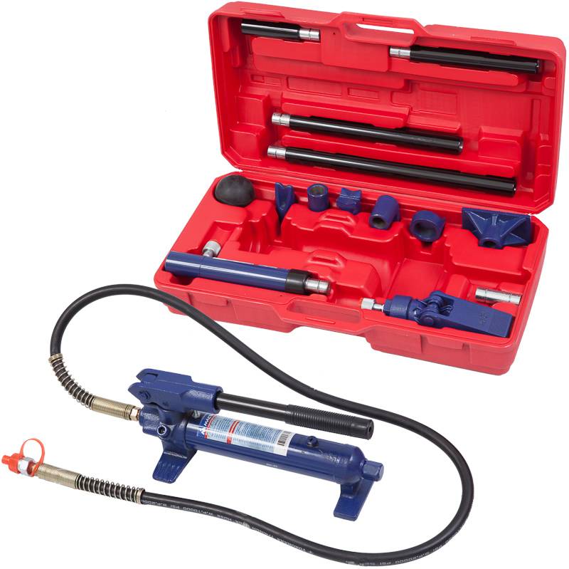 Набор гидравлического инструмента представляет собой компактный и удобный в эксплуатации комплект из гидравлического насоса, гидравлического цилиндра, удлинителей для упрощения работы и специальных фигурных соединяющих насадок. Набор применяется при проведении кузовного ремонта и работ с каркасом.