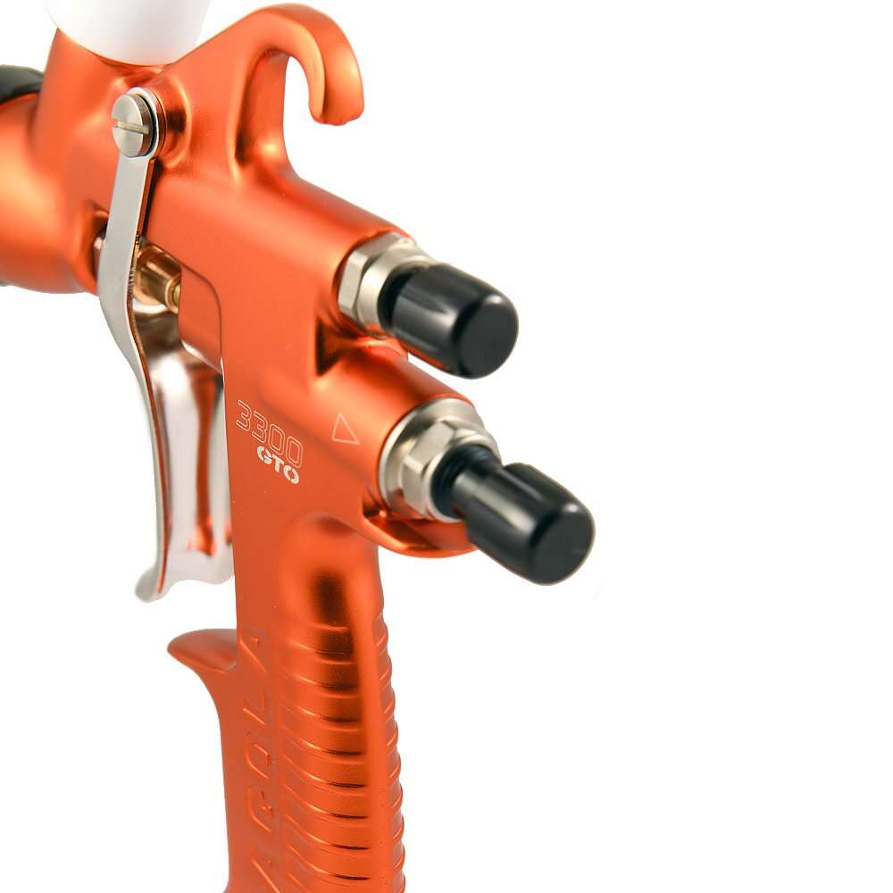 Краскораспылитель оснащен пластиковым бачком 650 мл. Эргономичный корпус удобно располагается в руке, имеет небольшой вес за счет применения в его конструкции легкосплавных материалов. На корпусе имеется три вентиля, которые позволяют произвести более тонкую настройку пистолета под ваши задачи. В нижней части рукоятки находится вентиль, отвечающий за регулировку давления воздуха поступаемого в краскопульт. С тыльной части рукоятки находится два вентиля : нижний отвечает за регулировку подачи материала, а выше него располагается вентиль, отвечающий за регулировку факела.