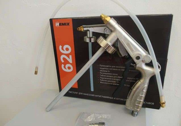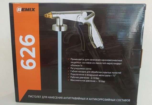 Пистолет для нанесения антигравийных и антикоррозийных составов. Используется для нанесения однокомпонентных защитных составов, поставляемые в 1л евробаллоне. Дополнительно в комплекте имеет регулируемое сопло и гибкую насадку для обработки скрытых полостей.