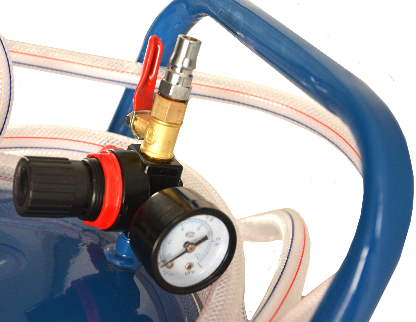 Работает от стандартного компрессора. Оптимальное давление воздуха на входе 1.5-2 атм. Максимальное давление предохранительного клапана 3 бар