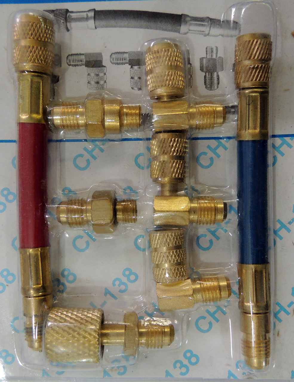 Набор переходников предназначен для подключения шлангов заправочной станции к сервисному порту системы кондиционирования автомобилей, в которых используют хладагент R-12.