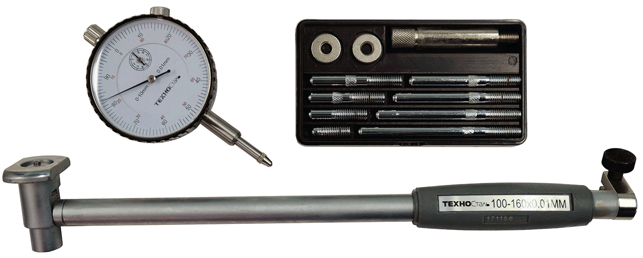 Предназначен для измерения внутренних размеров изделий двухточечным контактом с измеряемыми поверхностями относительным методом. Отсчетное устройство - индикатор часового типа. Диапазон измерений 100...160 мм. Цена деления 0,01 мм. Наибольшая глубина измерения 200мм.