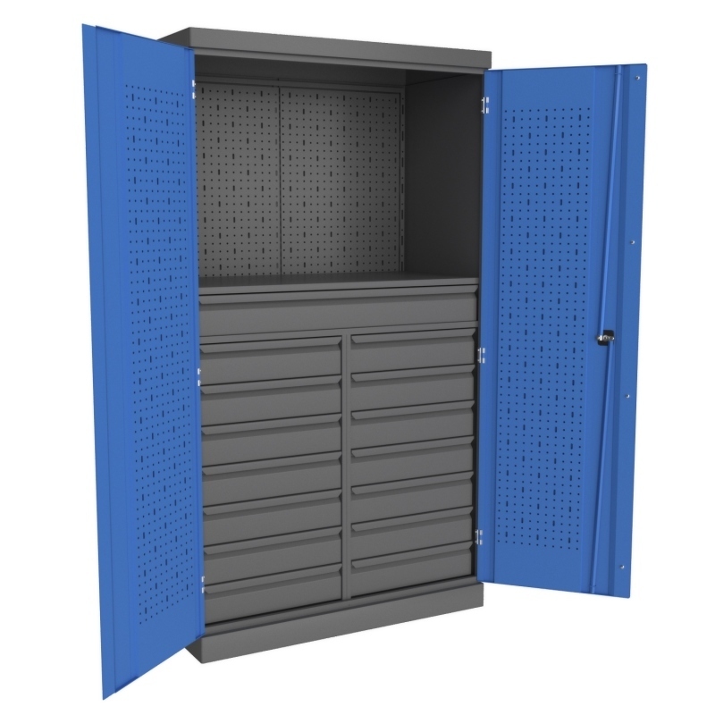 Шкаф инструментальный серии «PROFFI» предназначен для хранения оснастки, приспособлений и инструмента на рабочих местах в мастерских, цехах и других производственных зонах. Шкаф изготовлен из листовой стали и обеспечивает надежное запирание дверей ригельной системой.
